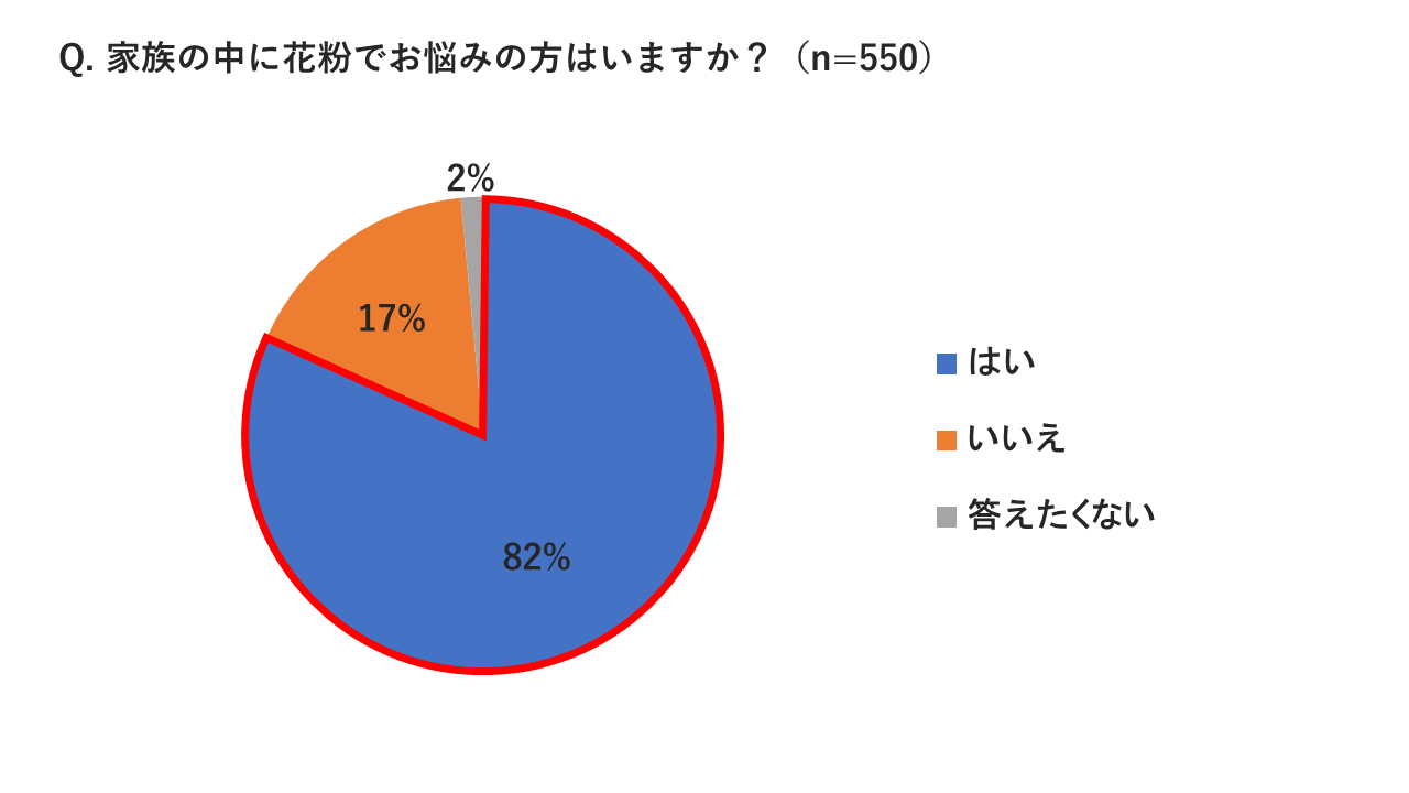 まず、「家族の中に花粉でお悩みの方はいますか」という質問をしたところ、8割を超える方が「はい」と回答しており、回答者本人とその家族を含めてご家庭で多くの方が花粉に悩まされているようです。