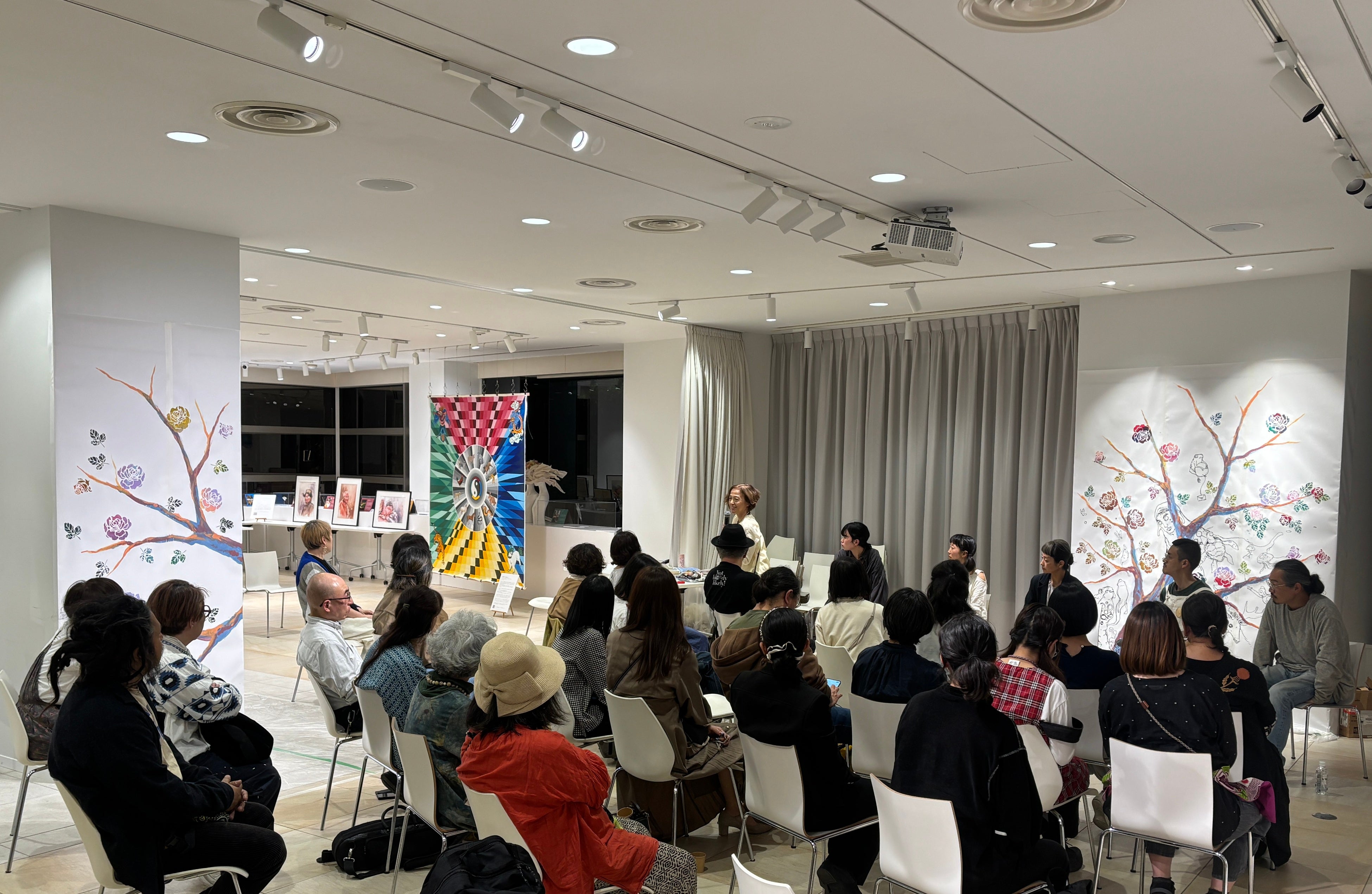 トークタイムになると来場者が着席。はじめに17年に渡ってウォールアートプロジェクトへ協賛している貝印についての説明や、協賛することとなった経緯などを貝印株式会社の平岩暢より伝えました。次にNPO法人ウォールアートプロジェクトよりフォレストアートフェスティバルのドキュメンタリー映像を上映し、内容を説明しました。2026年に招聘されるアーティストたちからは、ラダックで予定しているワークショップや制作への抱負が語られました。ラダックともオンラインで繋ぎ、ラダックの人々やアーティストたちがこのプロジェクトへ寄せる期待や、これからも日本とインド、ラダックが共に手を取り、協働していく決意を伝えました。