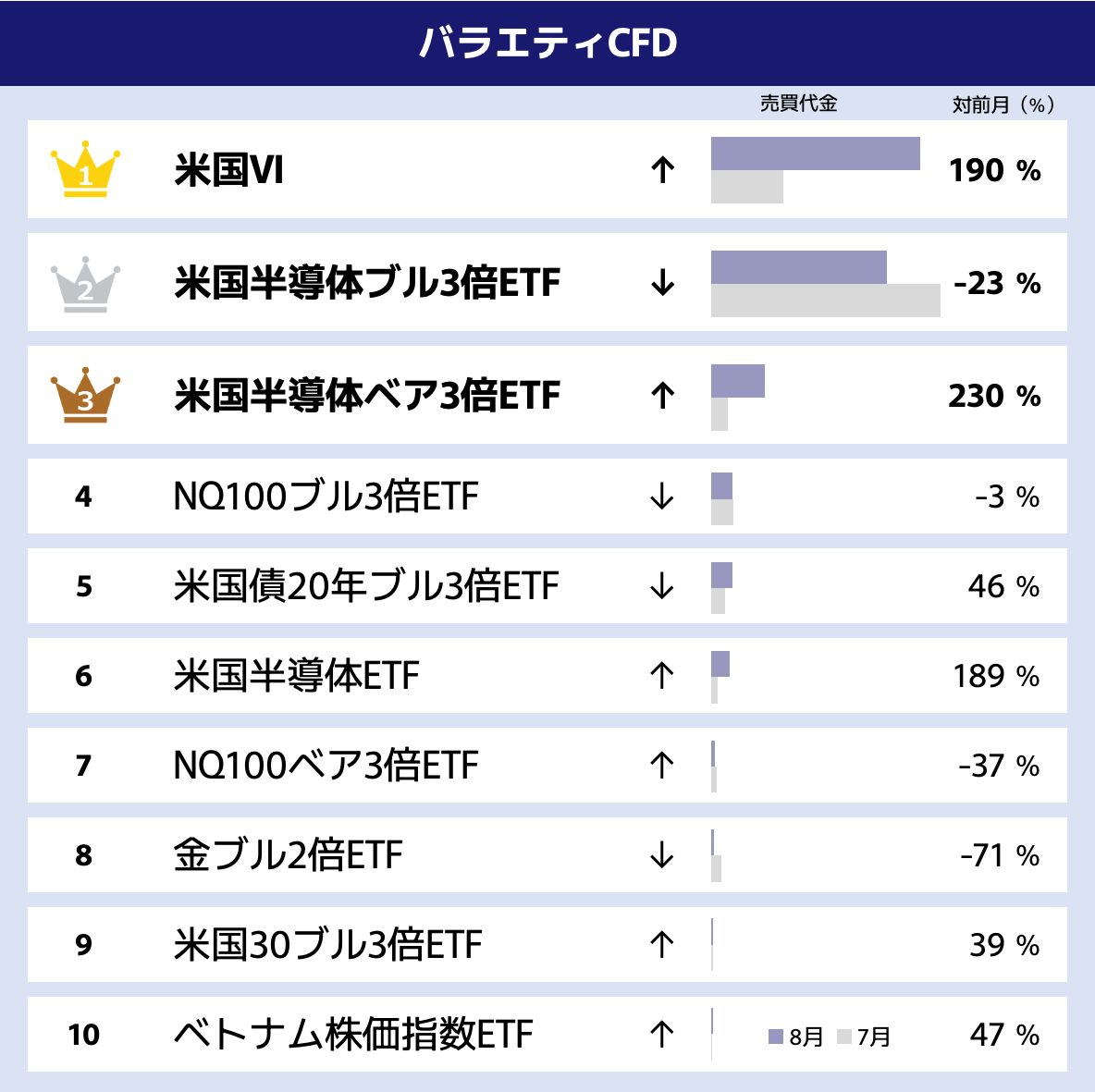 日経平均株価の急落は米国株式市場にも波及し、投資家の相場への先行き不透明感・警戒感を表すことから別名「恐怖指数」とも呼ばれ、一般的に20を超えると強い警戒感を示し40以上では危機水準とされているVIX指数が一時65超へと急上昇しました。これを受けて、バラエティCFDランキングではVIX指数の先物を参照原資産とする「米国VI」の売買代金が前月比3倍に迫る大幅な増加となり、7ヶ月ぶりに首位にランクインしました。