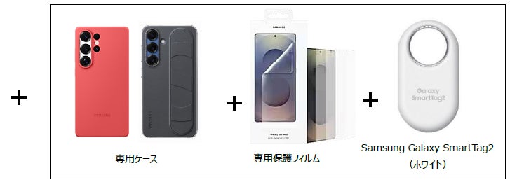 ・「Samsung Galaxy S25シリーズ」をご購入いただくと、お好きな専用ケース※、保護フィルムと「Samsung Galaxy SmartTag2(ホワイト)」のセットをプレゼントいたします。