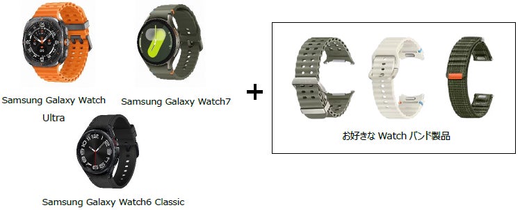 ・「Samsung Galaxy Watch Ultra」、「Samsung Galaxy Watch7」、「Samsung Galaxy Watch6 Classic」のいずれかをご購入いただくと、お好きなWatchバンド※製品を1つプレゼント。