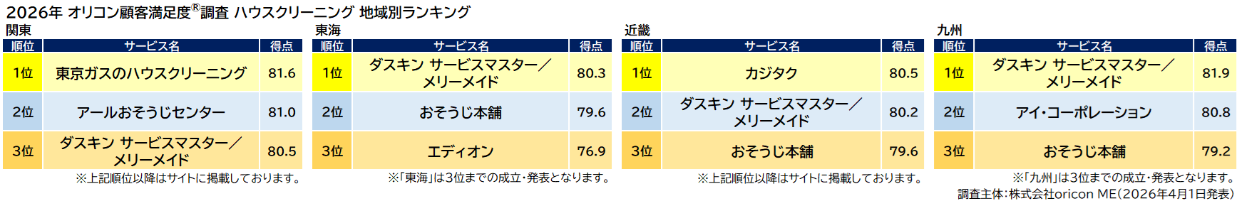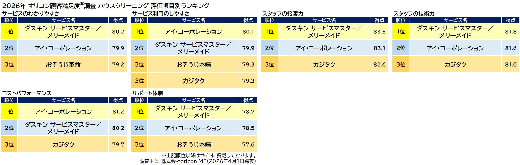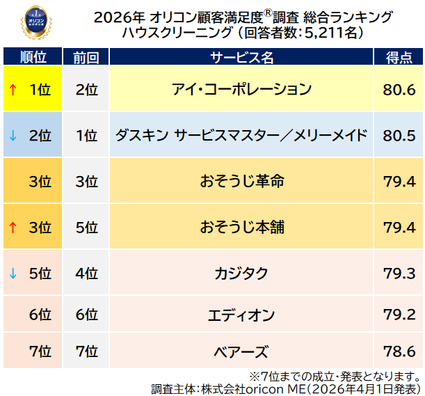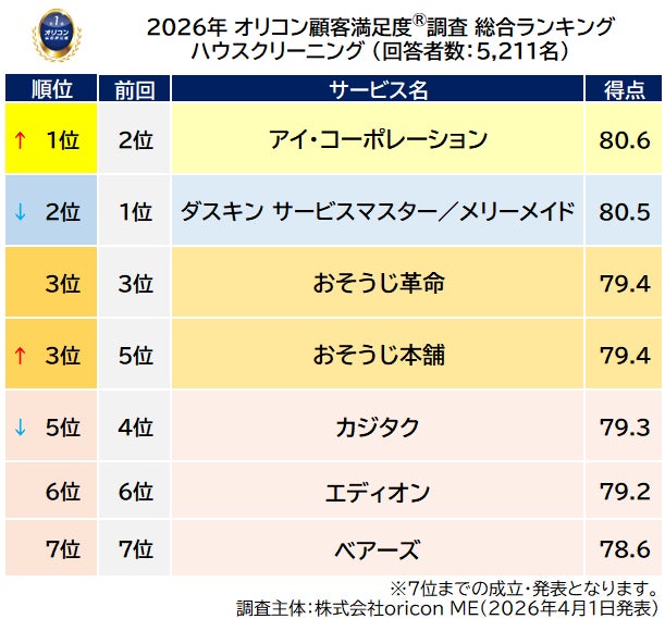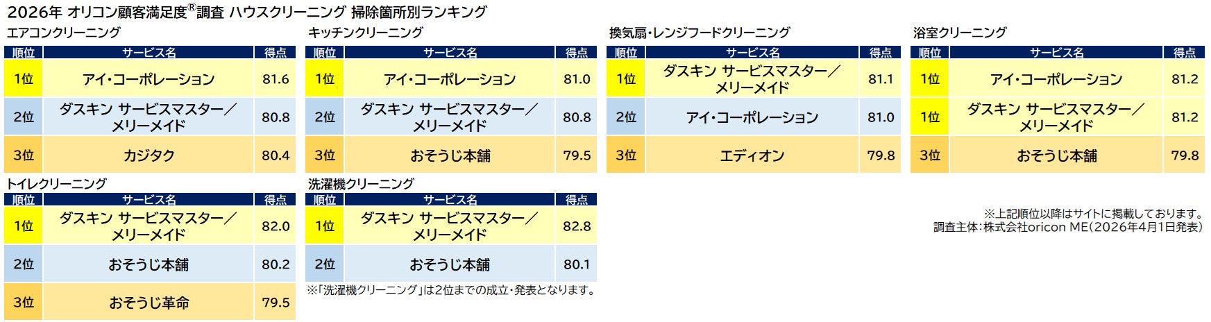 オリコン株式会社(本社:東京都港区 代表取締役社長:小池 恒、略称:オリコン)は、グループ会社である株式会社oricon MEが、実際のサービス利用者を対象に第三者の立場で実施した『ハウスクリーニング』の顧客満足度調査の結果を、2026年4月1日(水)14時に「オリコン顧客満足度®」公式サイト内にて発表いたしました。ランキングの結果は、下記の通りとなりました。