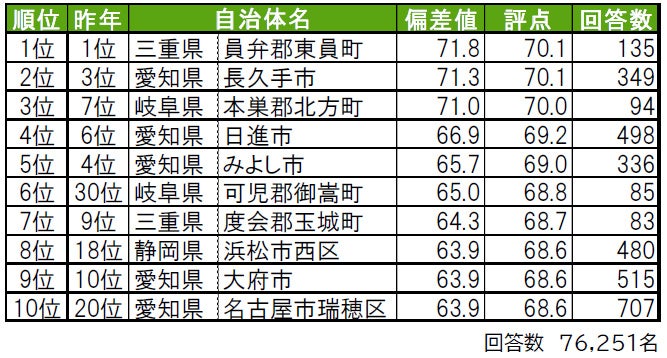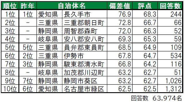 1位は2年連続で愛知県長久手市で、「住みここち」「街に誇りがある」でも1位、「街の幸福度」「街に愛着がある」では2位と高い評価を得ています。2位は三重県三重郡朝日町で、「街に愛着がある」では6位です。3位は静岡県周智郡森町で、「街に誇りがある」2位、「街に愛着がある」3位です。2位と3位の自治体は、昨年は累計回答数が50名未満だったためランキング集計対象外だった町です。