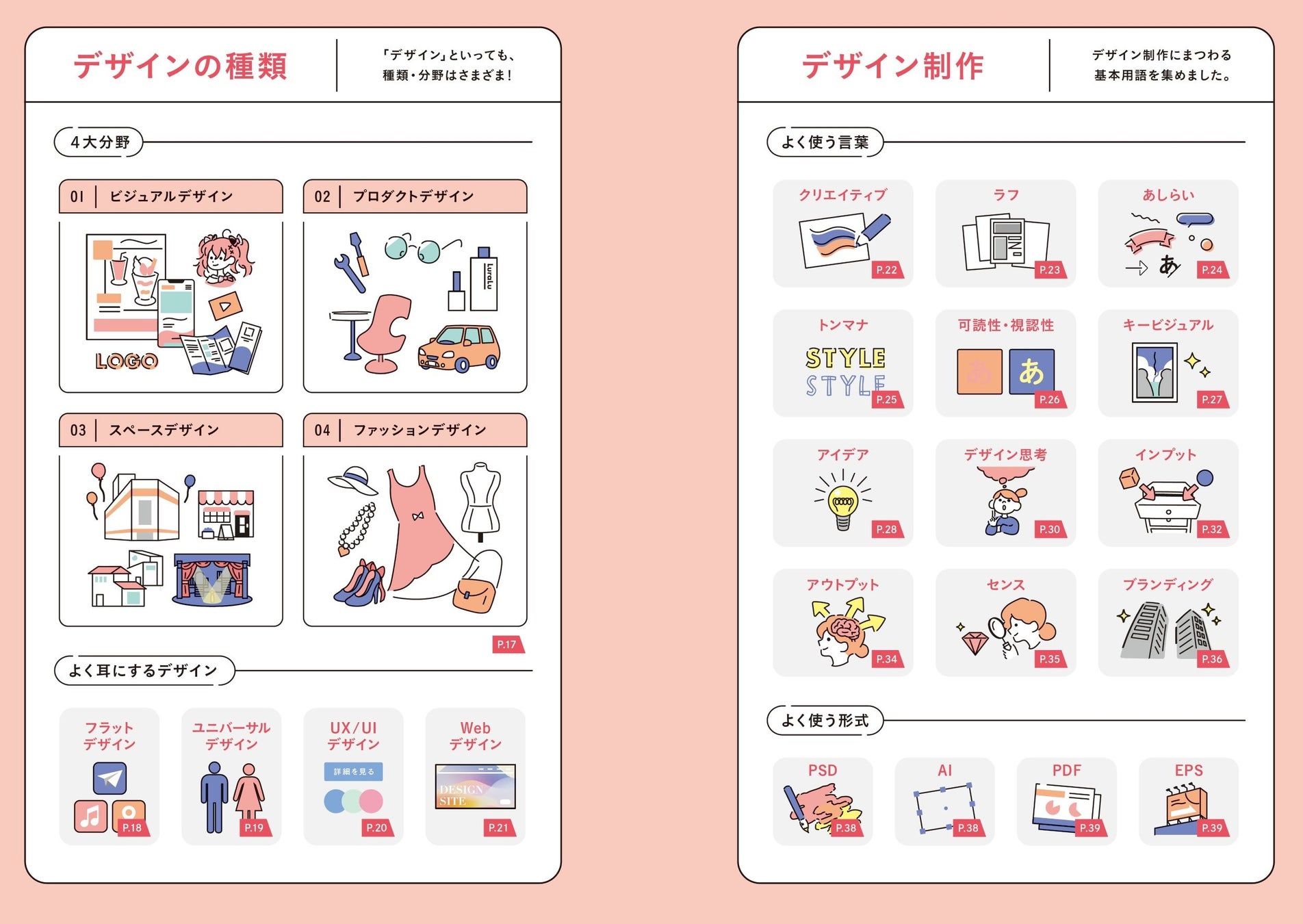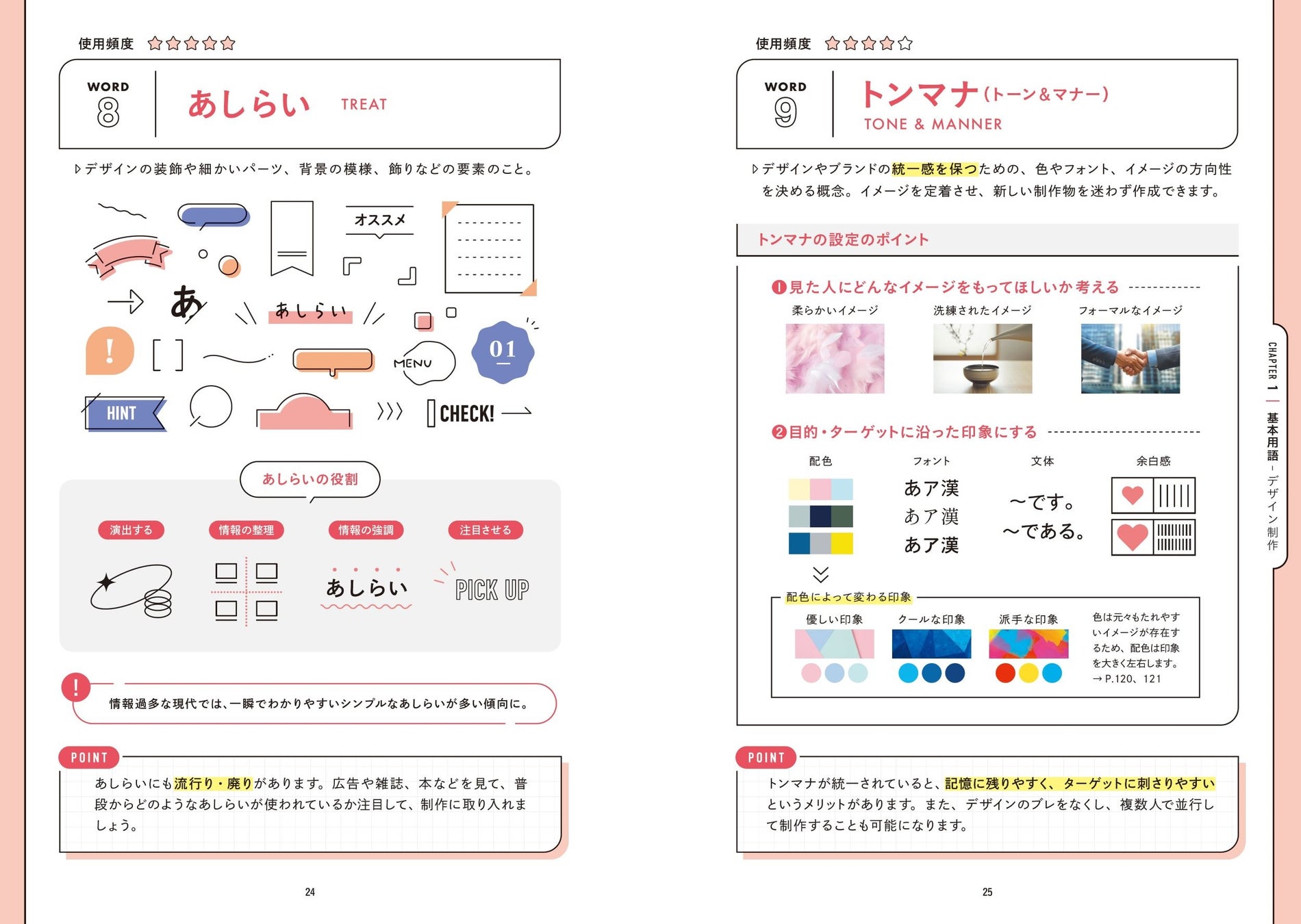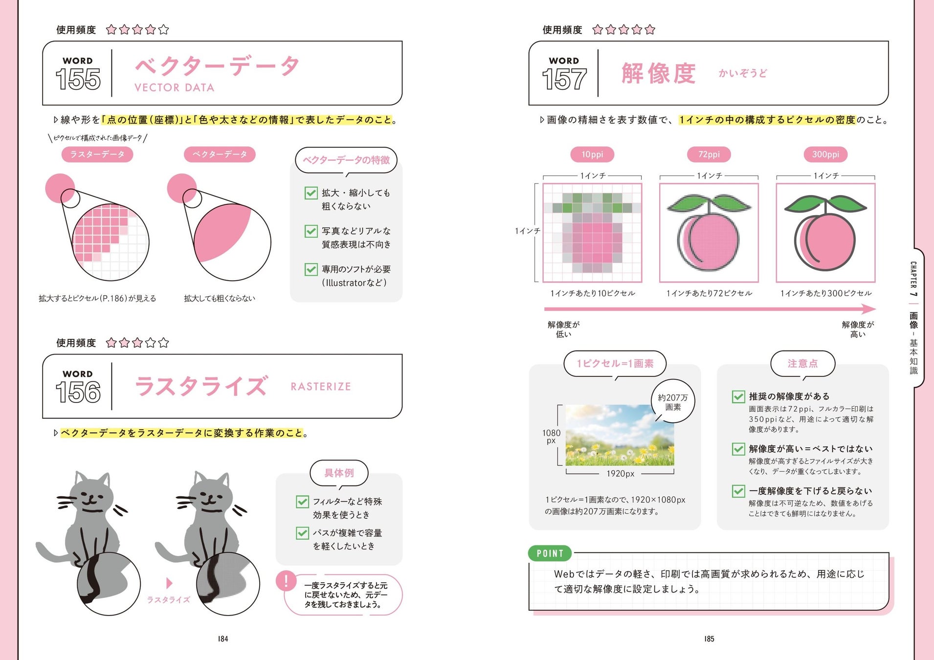 なんとなく使っていた言葉も、ひと目で「そういうことか!」と理解できる、ありそうでなかった1冊です。色の基本やレイアウト、画像・印刷・Webの基礎知識や、制作現場でよく使われるビジネス用語まで、デスクに置いて活用してください!