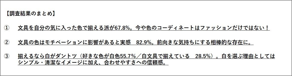 ③ 揃えるなら白がダントツ(好きな色が白色 55.7%/白文具で揃えている 28.5%)。