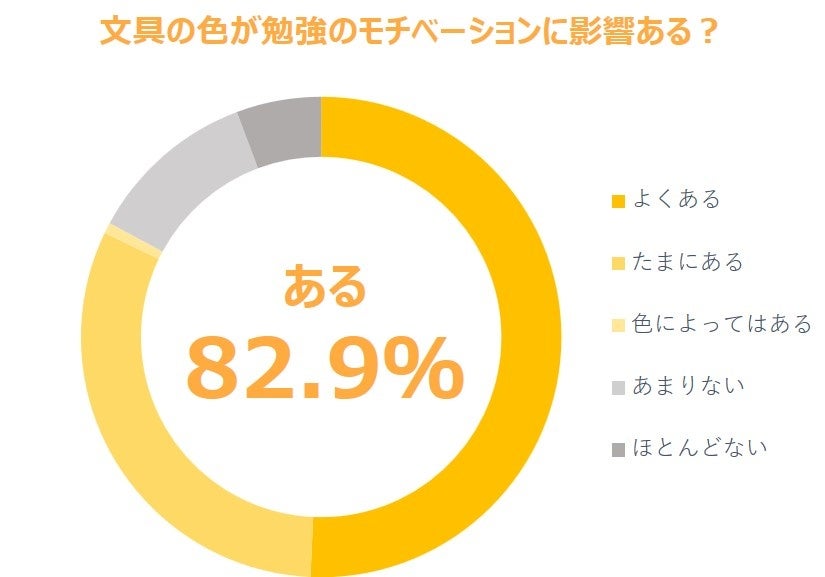 色の選択が勉強にどのような影響がありそうかを探るため、「文具の色が勉強のモチベーションに影響ある?」という質問をしたところ、「よくある」「たまにある」を合わせて82.9%という結果になりました。