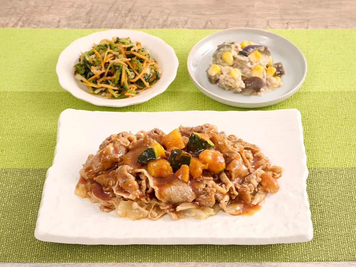 人気のスタミナ焼肉を、ナッシュ基準の糖質・塩分設計のままボリュームアップ。キャベツ・えのき・かぼちゃを添えて、彩りと満足感のある一皿に仕上げました。牛肉は特製だれで味付けし、野菜と一緒に食べることで最後まで飽きずに楽しめます。