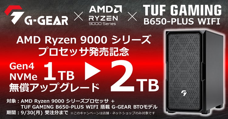 AMD Ryzen 9000シリーズ プロセッサとASUS TUF GAMING B650-PLUS WIFI マザーボードを搭載した G-GEARをご購入いただくと、