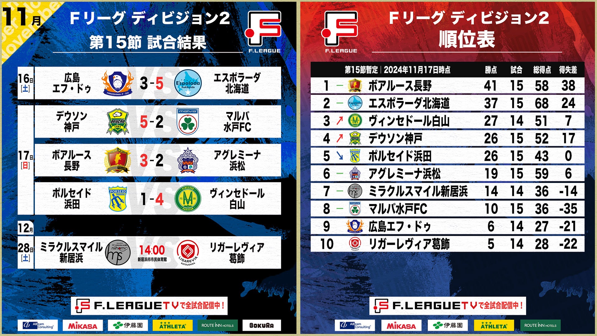11月16日(土)〜17日(日)に実施したFリーグ2024-2025 ディビジョン2 第15節の4試合について結果をお知らせいたします。