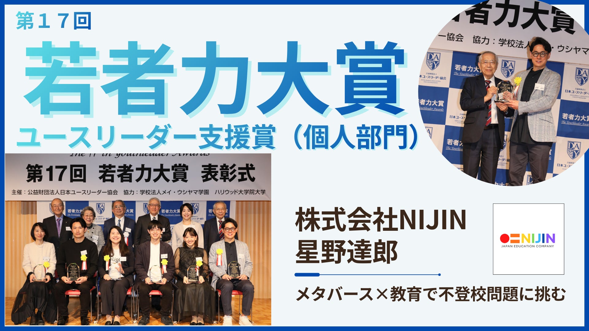 株式会社NIJIN(本社:東京都、代表取締役社長:星野達郎)は、このたび、当社代表取締役社長・星野達郎が、「第17回若者力大賞」においてユースリーダー支援賞(個人部門)を受賞したことをお知らせいたします。