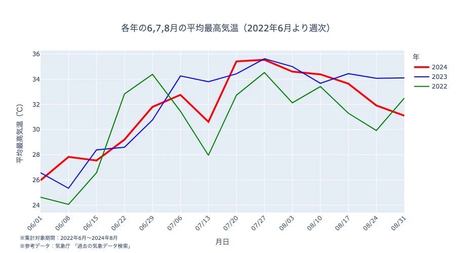 気象庁の公開データを用いて直近3年間で東京における6月、7月、8月の1週間ごとの平均最高気温を比較したところ、3年間で大きな差は見受けられませんでした。