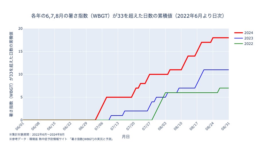 東京の直近3年間の6月、7月、8月において、この暑さ指数が33を超えた日数の累積を比較したところ、2024年の夏は過去2年と比べてその回数が明らかに多いことがわかりました。2022年と比較して、2024年の累積値は約2.6倍となりました。