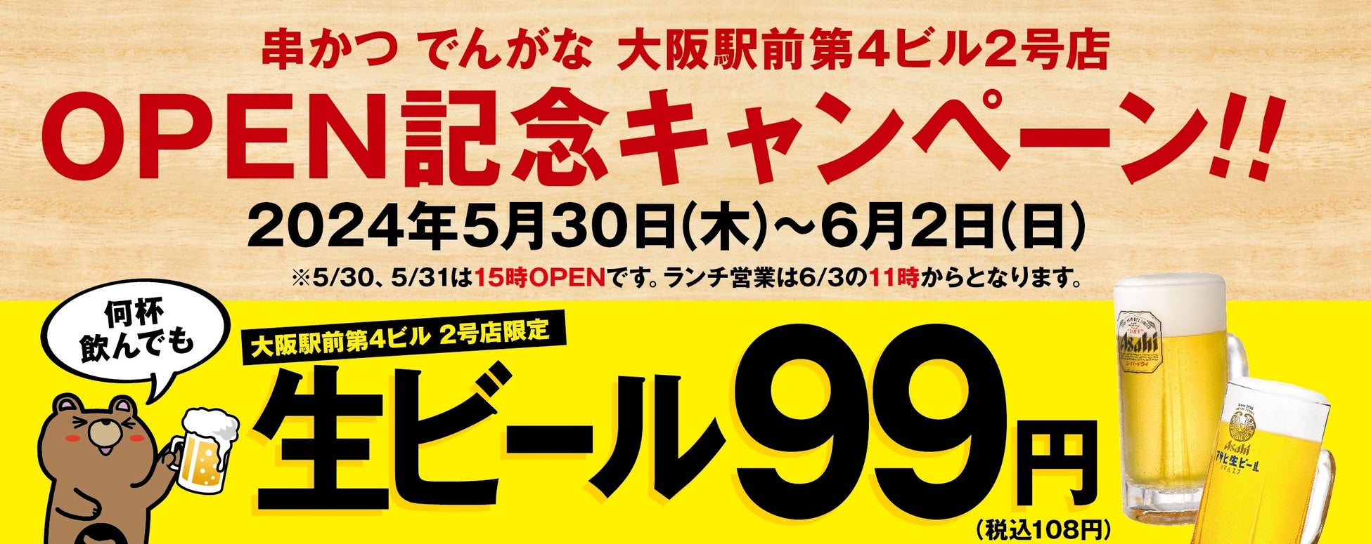『串かつでんがな 大阪駅前第4ビル2号店』5月30日(木)オープン!!オープン記念キャンペーン開催!!生ビールが超お得!!