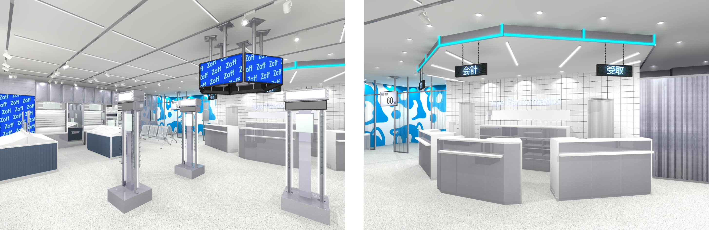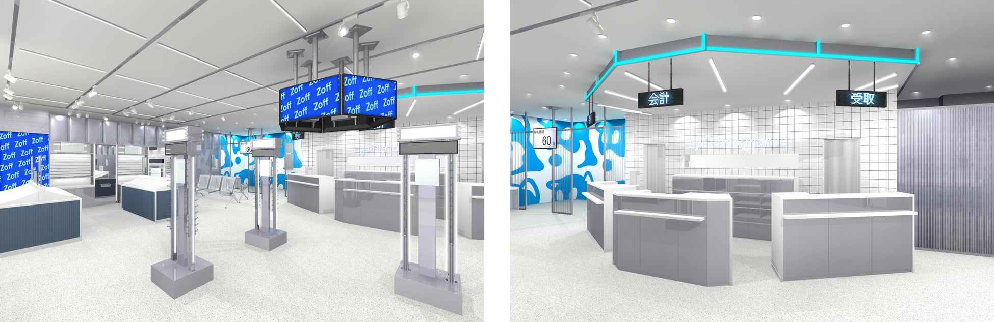 「Zoff 池袋サンシャインシティ・アルパ店」の店内は、シルバーとZoffのブランドカラーであるブルーがメインカラーです。壁面上部には立体的なデザインが施され、メイン什器にはメタリックな質感の素材を使用するなど、スペースシップを彷彿とさせる未来的な表現をしています。店内中央の受付は、まるでコックピットのように天井にライン照明が設置され、未来を見据えた空間を演出。検眼室との仕切りは、メガネのレンズ素材でもあるポリカーボネートを波板状に加工したパネルを使用した、透明感のあるデザインが特徴です。