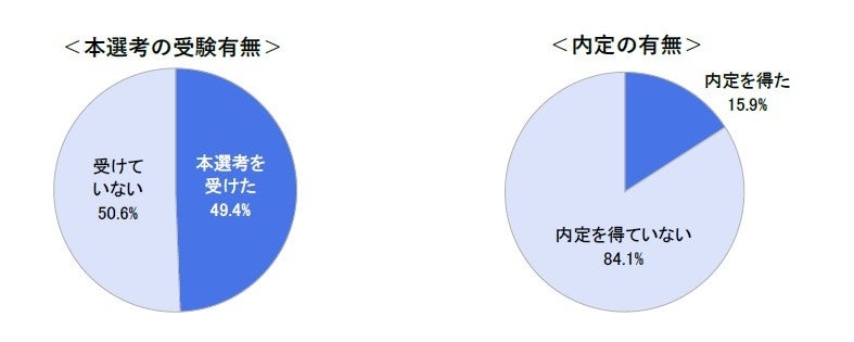 ○「本選考を受けた」49.4%で、平均3.2社受験。「内定を得た」学生は全体の15.9%