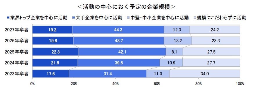 ○「業界トップの企業」19.2%、「大手企業」44.3%。大手志向の学生は今年も6割を超える