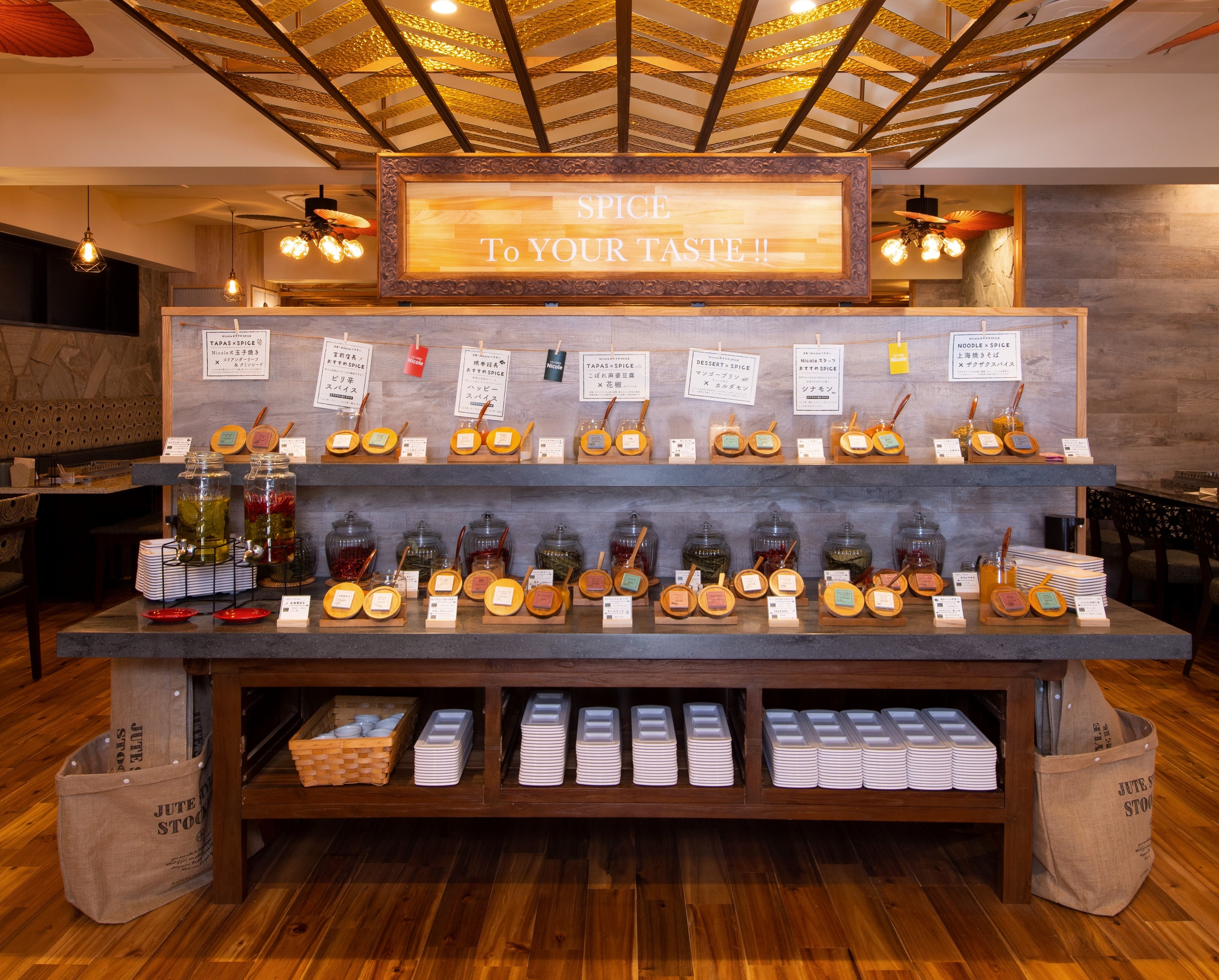 『スパイスBBQ Nicole』は、全卓に自動回転串焼き機、通称"くるり串"を設置した新しい形のバーベキューレストラン。食材を全自動回転串焼き機にセットするだけで、ジューシーでベストな焼き具合のBBQに仕上がります。また、スパイスを30種類以上常備したスパイスコーナーを設置。お客様ご自身でお好みのスパイスを調合し、マイベストスパイスを見つけることができます。