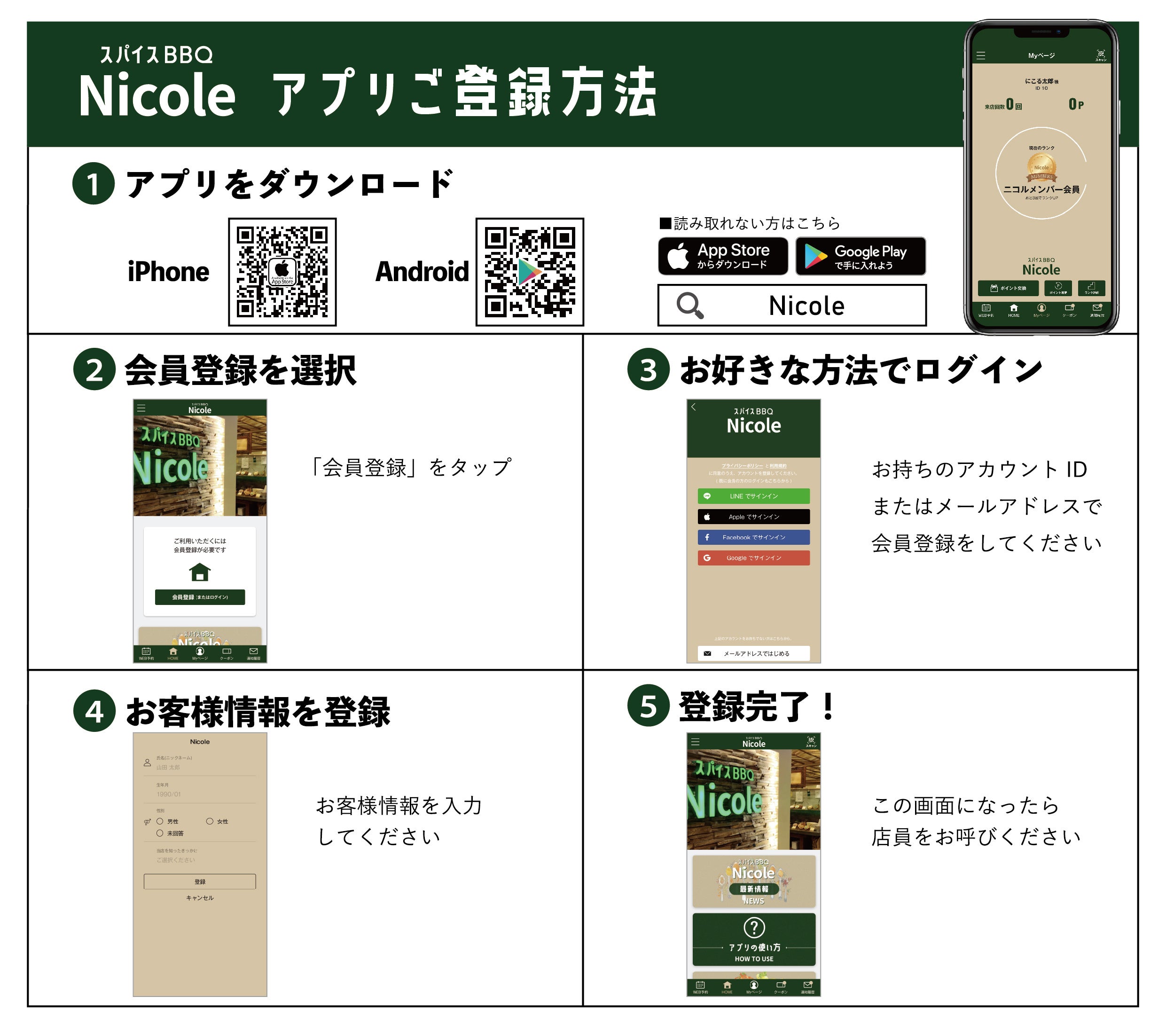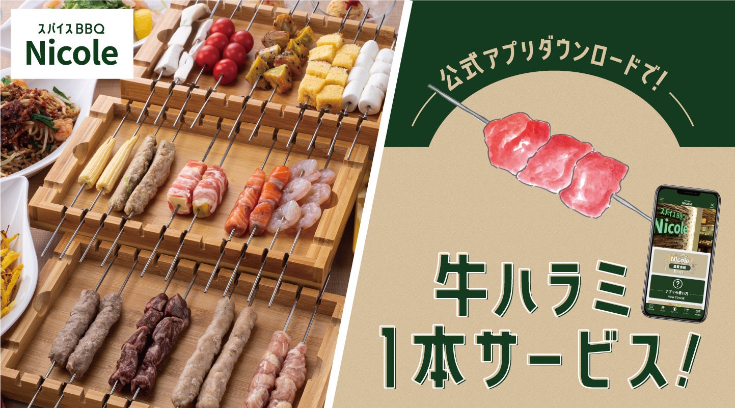 この度、『スパイスBBQ Nicole』では公式アプリをリリースいたしました。アプリ限定のお得なクーポン、キャンペーン情報やイベント情報など、お得で便利にNicoleをご利用いただけるコンテンツを随時配信していきます。また、3回のご来店で「ドリンク無料サービス」、10回のご来店で「お好きなくるり串5本プレゼント」など来店回数に応じて嬉しい特典も!さらに初回ダウンロード特典として、「牛ハラミ」(350円相当)を1本プレゼントいたします。この機会にNicoleのアプリをダウンロードしていただき、ジューシーな牛ハラミ串をお好みのスパイスと共にぜひお楽しみください。