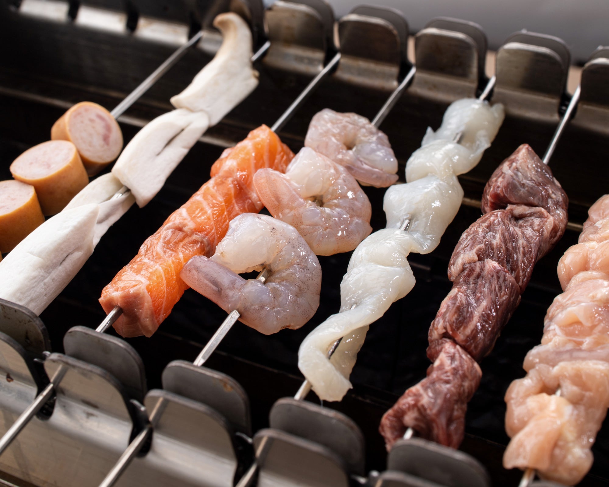 (豚とろ、ウインナー、鶏つくね、海老、ラム、牛はらみ、デザート串など、約30種類)