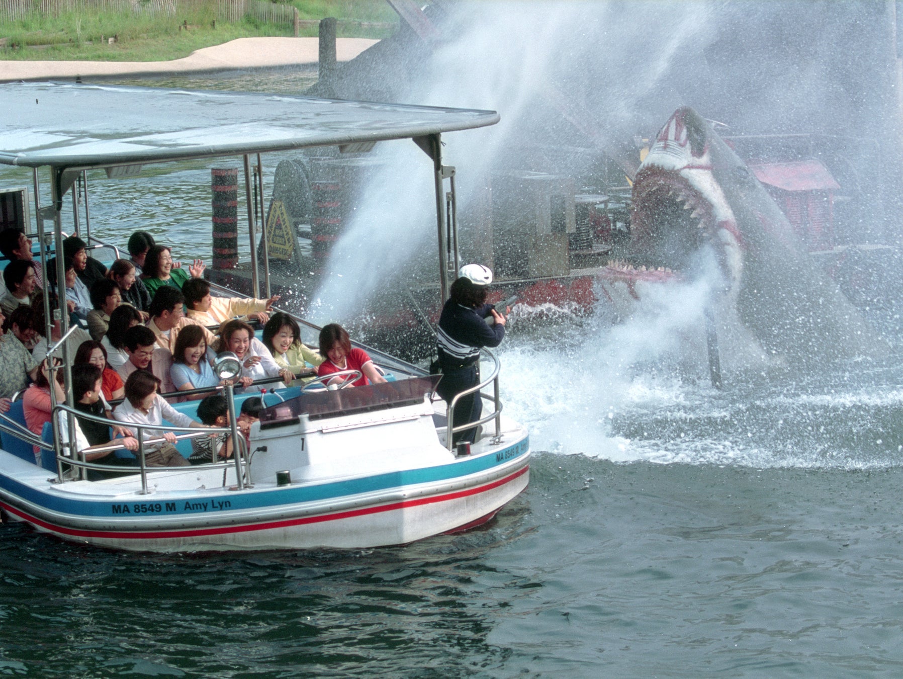 巨大な人喰いザメに襲われる恐怖のボートツアー。映画『ジョーズ』の海を舞台に、水しぶきをあげて巨大ザメが襲ってくる!