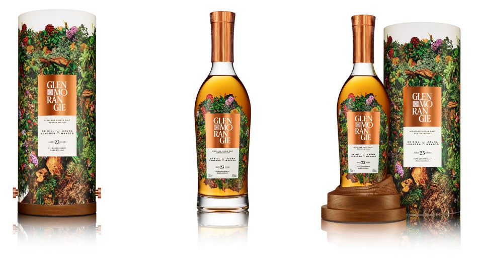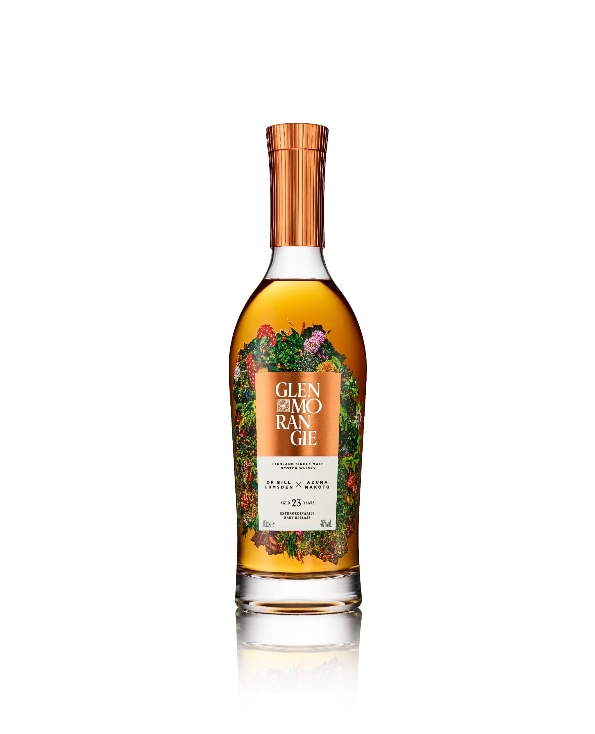 東 信氏とのコラボレーション第2弾となる「グレンモーレンジィ 23年 by Azuma Makoto」は、ビル博士が深みや複雑味の観点から厳選した原酒が惜しみなく使われ、樹々や土、苔のニュアンス、繊細な花のトップノートが次々に姿を現し折り重なる味わいが、まるで美しい生態系を思わせる味わいのウイスキーです。そしてその味わいとスコットランドの自然からインスパイアされた東氏が、200種類以上の草花で表現した作品「森羅万象」がボトルにあしらわれています。