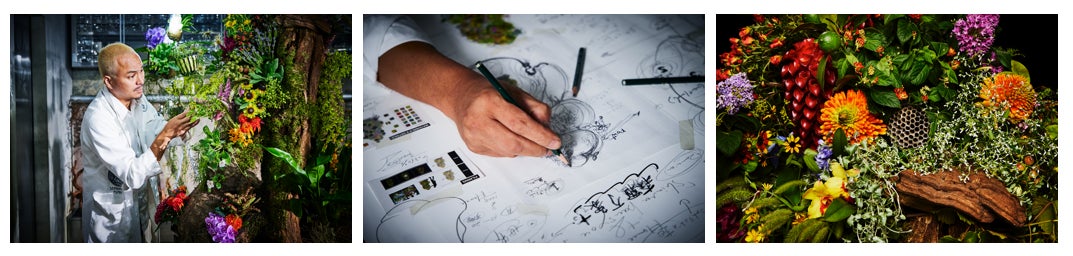 今回のコラボレーションは、2021年の限定エディションの制作で東氏や彼のクリエイター仲間と意気投合したビル博士が、植物による表現の可能性を追求し、再び東氏とのコラボレーションを熱望したことにより実現。東氏がグレンモーレンジィ蒸留所を訪れた際、森の中を散策していた二人は、その生態系の美しさからインスピレーションを受け、大地と空、そして自然界すべてを包み込む「森羅万象」という今回のテーマにたどり着きました。