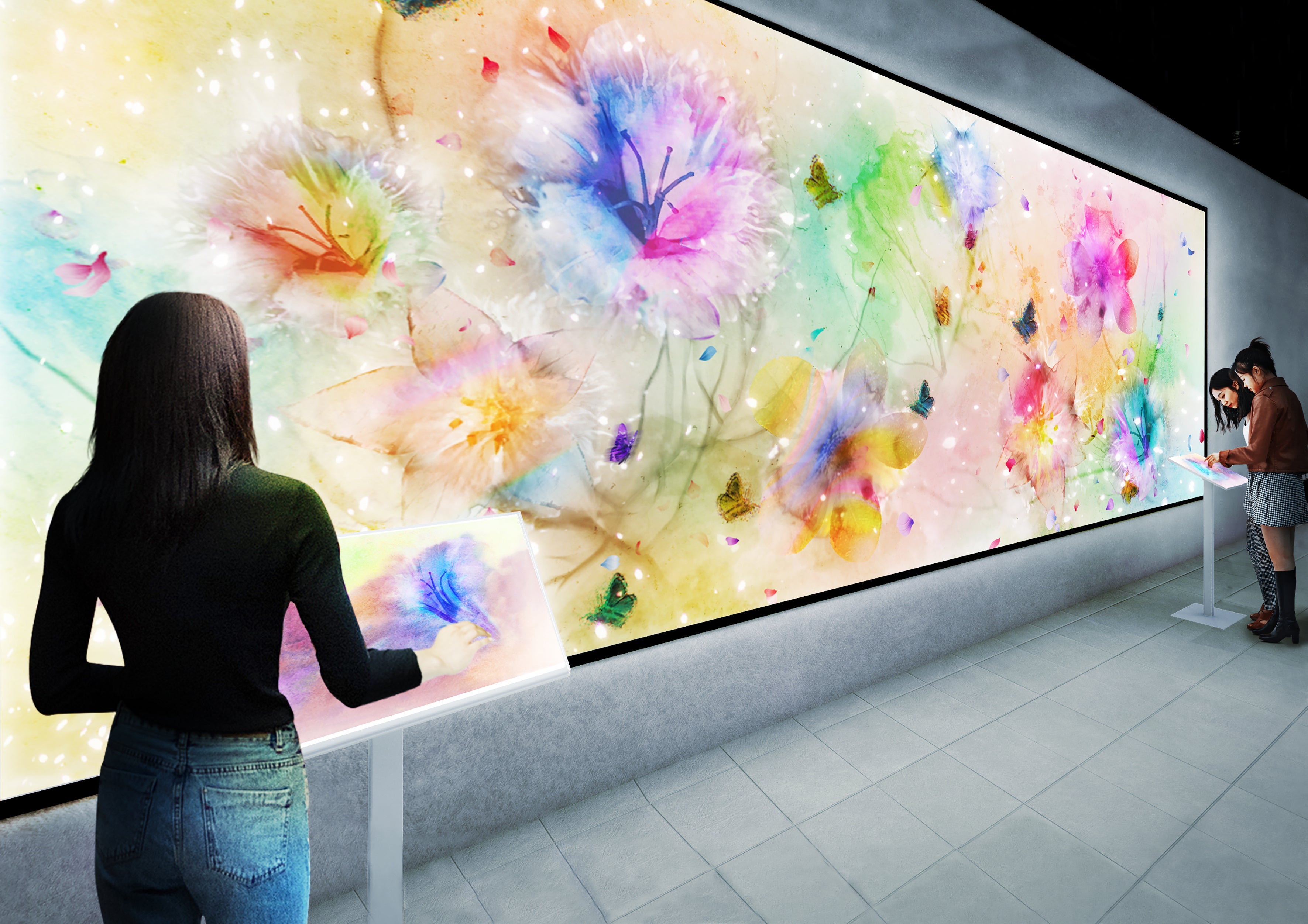 あなたが色を選びタッチすると、水彩絵具のように、植物、光、水などの自然界の要素が現れ、景色が変わっていくインタラクティブアート。グリーンで描かれた植物にイエローの光を与えると成長するなど、自然の生態系が生み出されていく。