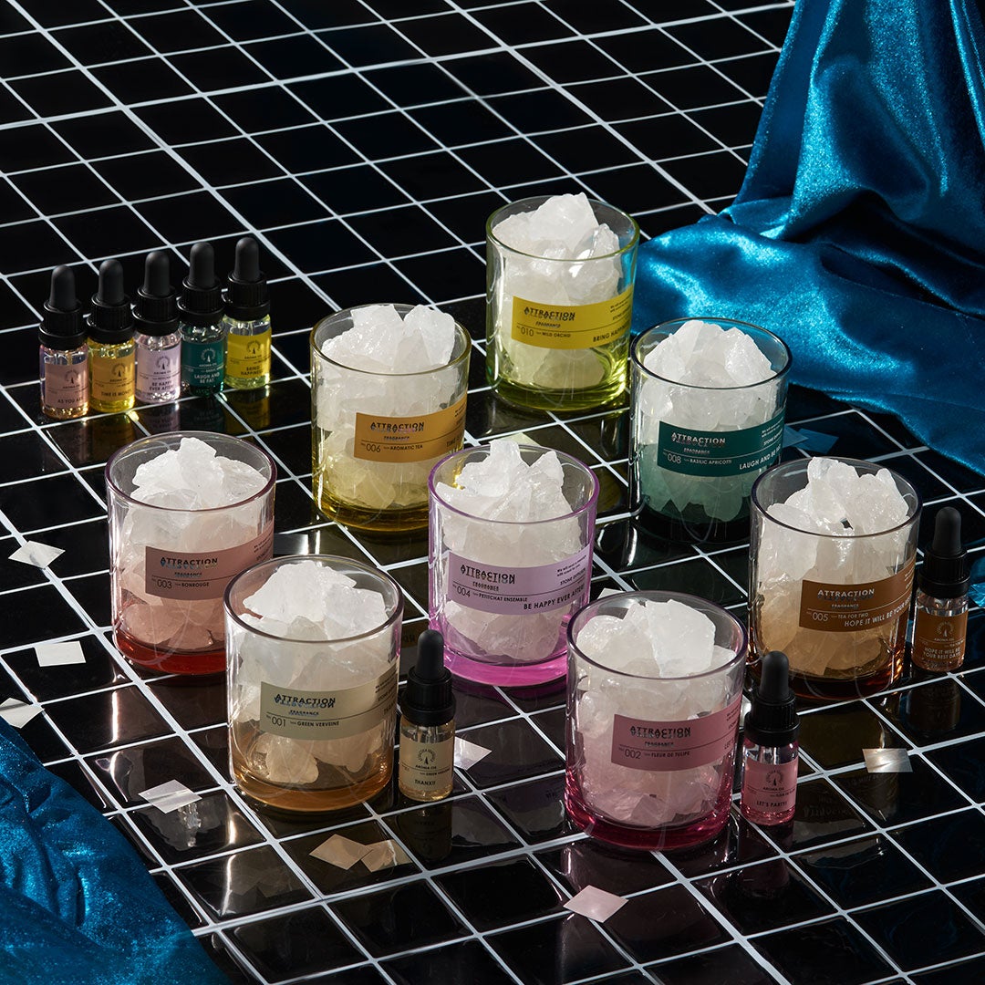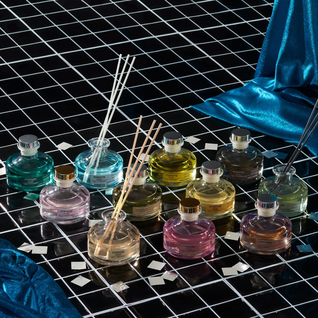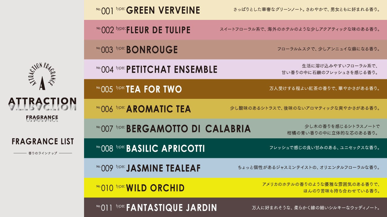 「遊園地のアトラクションのように、香りを選んで、香りで遊ぶ」がコンセプトの「ATTRACTION FRAGRANCE」では、ディフューザーやアロマオイル、お香やキャンドルなどのフレグランスアイテムを、種類豊富なラインナップで展開します。アイテムに使用される香りたちは、フレグランスマジシャンで「5W1H」の主宰「中田真由美(なかだまゆみ)」さん監修のもと、全11種類を共同開発しました。