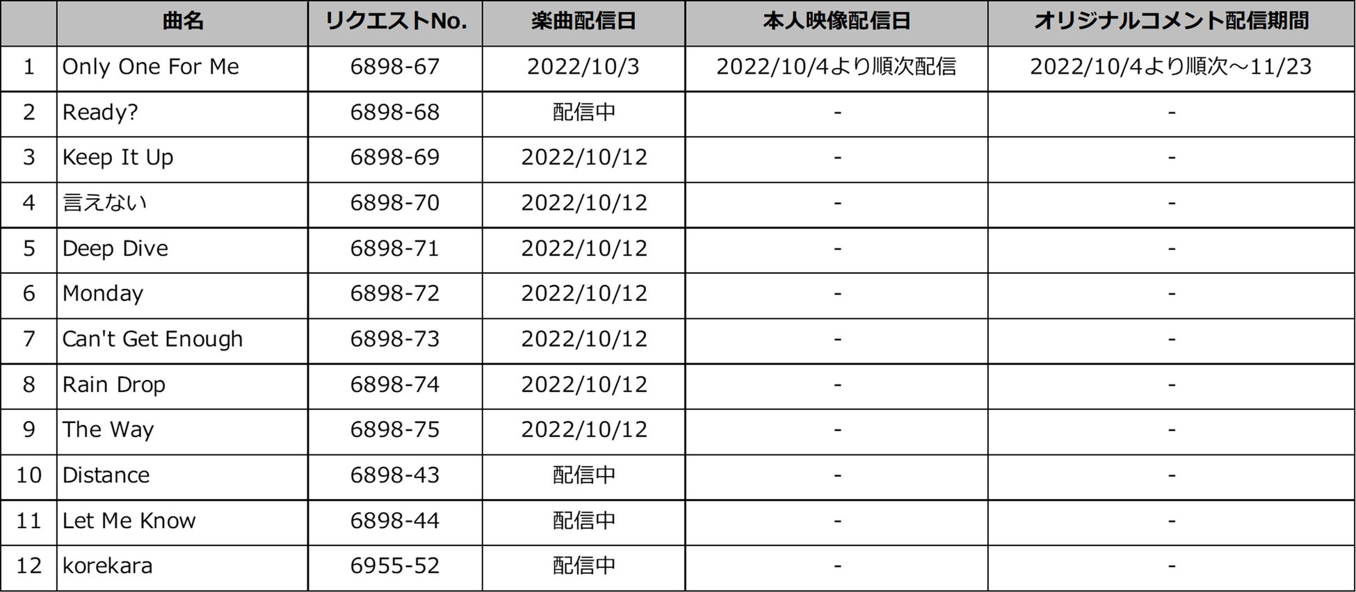 | ①通信カラオケDAMに『The Chocolate Box』収録曲(全12曲)を配信。*1 ②『The Chocolate Box』収録曲のうち、アルバムリード曲「Only One For Me」の期間限定本人映像を配信。 また、楽曲終了後にDAMでしか見ることができないオリジナルコメントを期間限定で配信。*2 【10月4日(火)〜11月23日(水・祝)】 ③通信カラオケDAMにおいてカラオケ演奏の曲間に配信しているエンターテインメント情報コンテンツ 「DAM CHANNEL(ダムチャンネル)」に出演。 【10月4日(火)〜10月31日(月)】 ④デンモクの特設ページから『The Chocolate Box』収録曲を予約し、表示されたQRコードより必要 項目を入力して応募した方の中から抽選で、岩田剛典『オンライントーク会』に抽選で合計10名様を ご招待。 さらに、デンモクの「岩田剛典スペシャルページ」より、レアなデジタルコンテンツをもれなく プレゼント。 【10月3日(月)〜11月23日(水・祝)】 *1 楽曲により配信機種および配信日は異なります。 *2 本人映像対象機種はLIVE DAM AiおよびLIVE DAM STADIUMシリーズです。 オリジナルコメント対象機種はLIVE DAM Aiです/配信日は10月4日から11月23日までの 期間限定です。 |