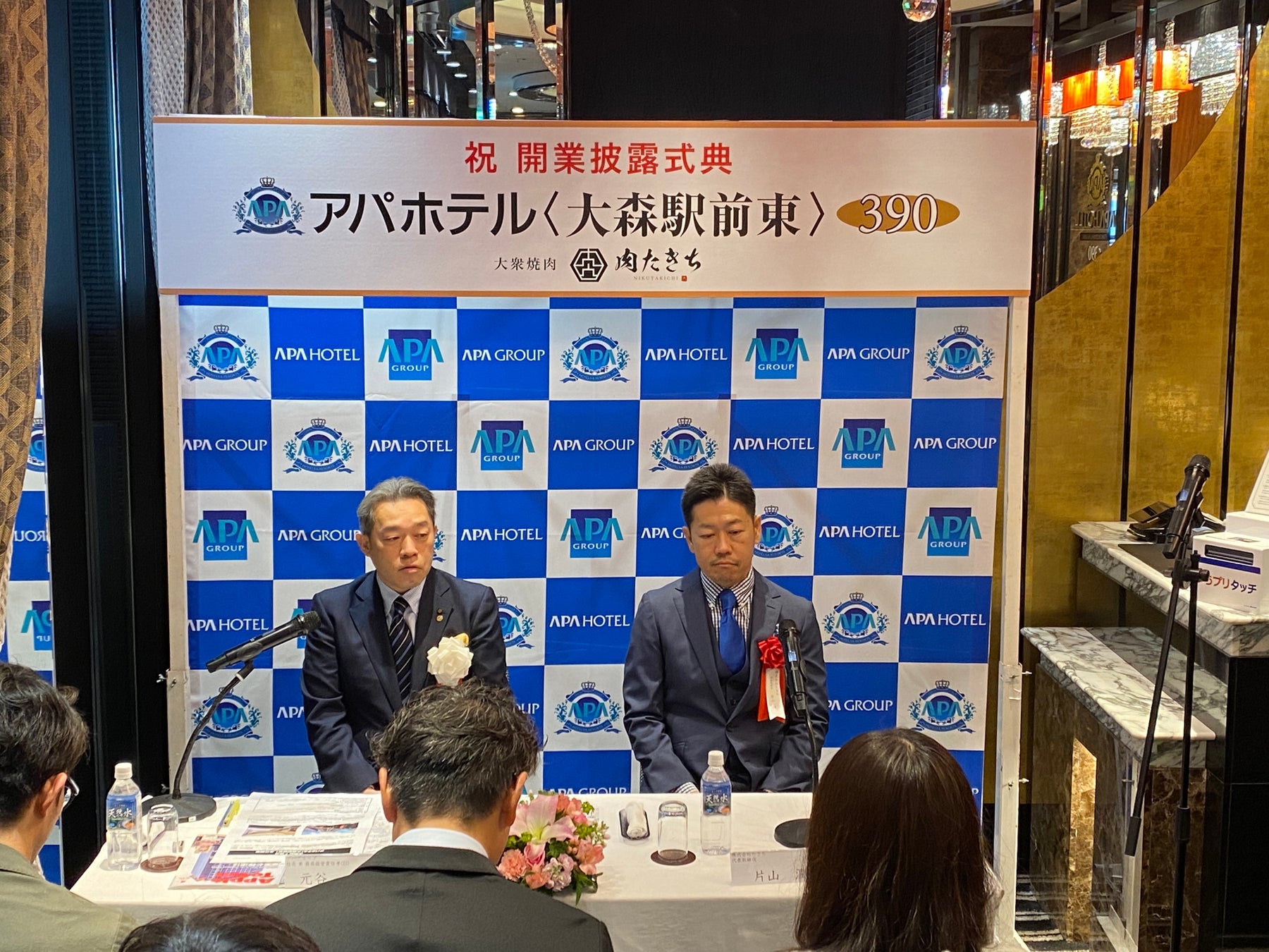 アパグループ社長兼最高経営責任者(CEO)の元谷一志は、記者発表において「本日、大森駅エリアで5年ぶりに2棟目のホテルを開業できたことを大変嬉しく思う。当ホテルの開業により大田区では7ホテル・1,413室が運営中となるが、大田区エリアは羽田空港や品川駅へのアクセスも良く、訪日外国人需要も大いに期待できることからまだまだ伸びしろのあるエリアと捉えており、アパホテルとしても今後さらに拡大していきたいと考えている。当ホテルでは、各階アメニティバーの設置、客室チェアの耐荷重アップ、ゆうパックラベル印字サービスの導入という3つのイノベーションを施した。ひとつひとつは小さなイノベーションかもしれないが、お客様の痒い所にまで手が届くサービスを提供し、満足度の向上と他社ホテルとの差別化を図っていく。来月から大阪・関西万博が開幕することで、今まで以上に多くの外国人の方が日本を訪れることとなる。東京から大阪までを巡るゴールデンルート上にも多くのアパホテルが出店しているので、ぜひ日本観光と合わせて各地のアパホテルを巡っていただきたい。国内外問わず多くの方に愛されるホテルを目指し、今後も更なる進化と拡大を遂げていきたい。」と述べた。
