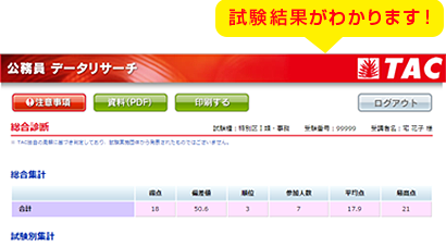 多くの受験生が参加するTACの本試験データリサーチによるデータ分析に、ぜひ積極的にご参加ください。TAC以外の受験生の方もご参加いただけます。また、ご登録いただいたくと、公務員試験「東京都Ⅰ類B[行政/一般方式]採用試験」・「特別区Ⅰ類[事務]採用試験」専門記述試験・論文試験 TAC解答速報 をご覧いただけます。