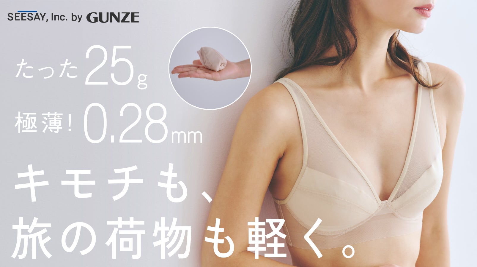 グンゼ株式会社(本社:大阪市北区、社長:佐口 敏康、以下グンゼ)の100%出資子会社である「SEESAY(シセイ)」(本社:東京都渋谷区、社長:奥田 洋一)は、応援購入サービス「Makuake(マクアケ)」にて、旅の下着の悩みを解決するノンワイヤーブラジャー「エアヴェールブラ」とセットショーツを2025年11月7日(金)より先行発売いたします。「エアヴェールブラ」はわずか25gという軽さを実現。セットショーツも27gと超軽量設計で、旅の荷物をぐっと軽くします。さらに、速乾性を備え、移動の多い旅先での快適な着心地もキープ。また、ショーツはクロッチ部分に吸水布を採用。予期せぬモレなどにも対応できる心強い仕様です。軽さと機能性を兼ね備えた「エアヴェールブラ」&ショーツは、あなたの旅の自由と❝ここちよさ❞を叶える、新しい旅のマストアイテムです。