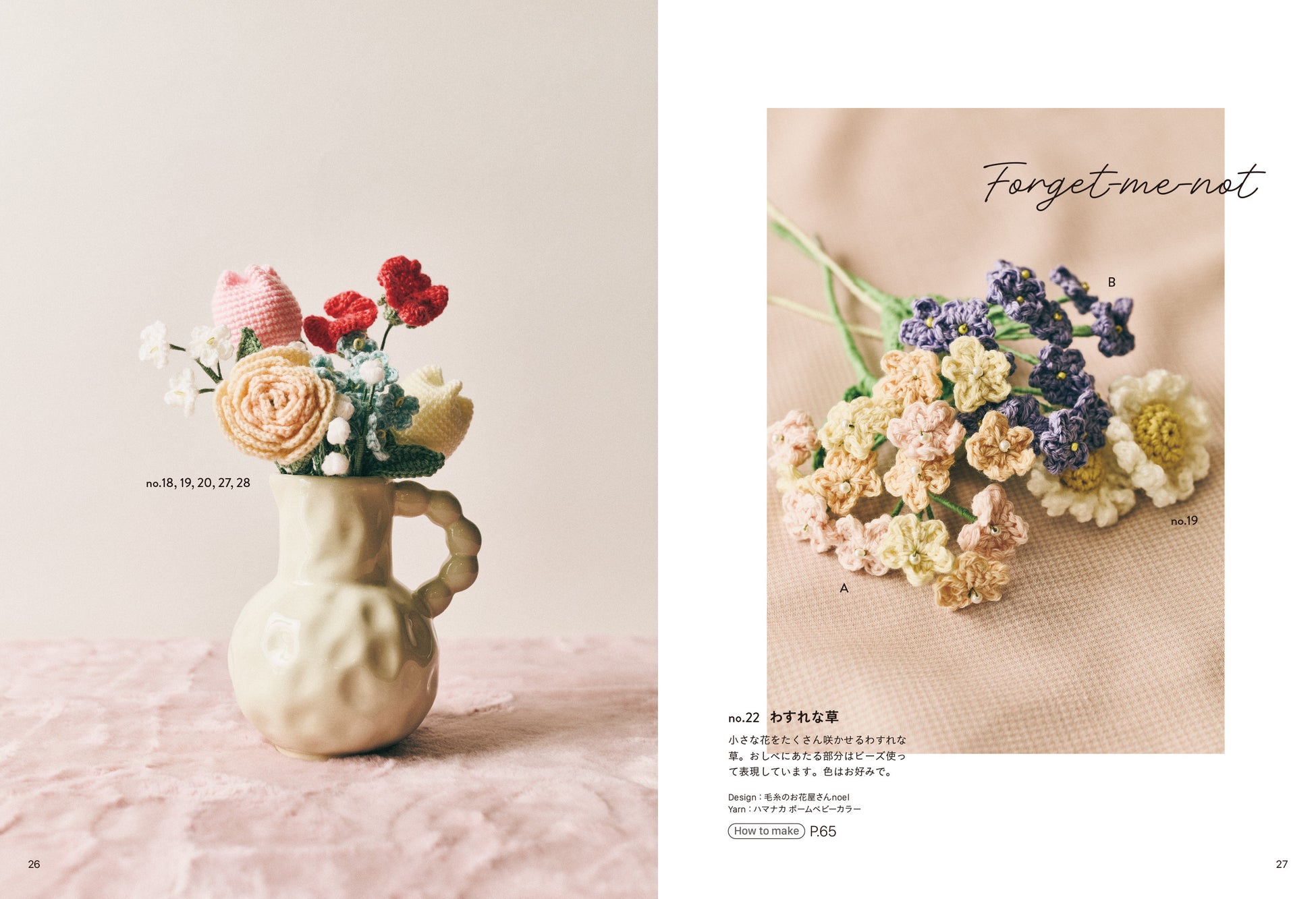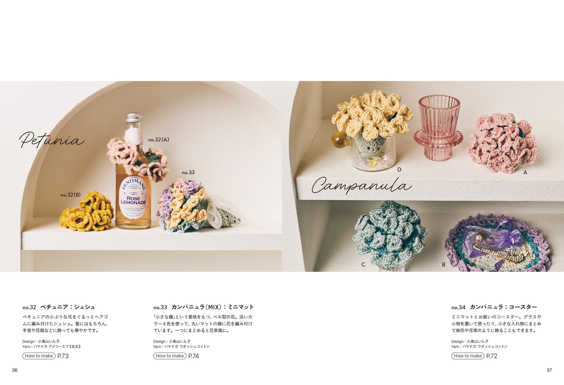 出来上がったお花はお気に入りの花瓶に飾ったり、数種類を組み合わせて花束にしたり。くるっと丸めると小さな花束になるコースターやシュシュといった小物まで、たっぷり全36アイテムを収録しています。