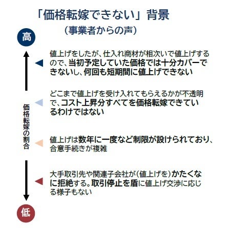 食材や人件費など運営コストが上昇しているものの、価格に反映ができない給食事業者の声が多く聞かれた。競争入札が多いため「値上げは数年に一度など制限がある」といった声や、社員食堂などでは「(値上げを)かたくなに拒絶され、取引停止を盾に交渉に応じる様子もない」など、厳しい状況を訴える声が相次いだ。価格転嫁ができた事業者でも、「何回も短期間に値上げできない」「どこまで値上げを受け入れてもらえるかわからない」といった声が聞かれた。