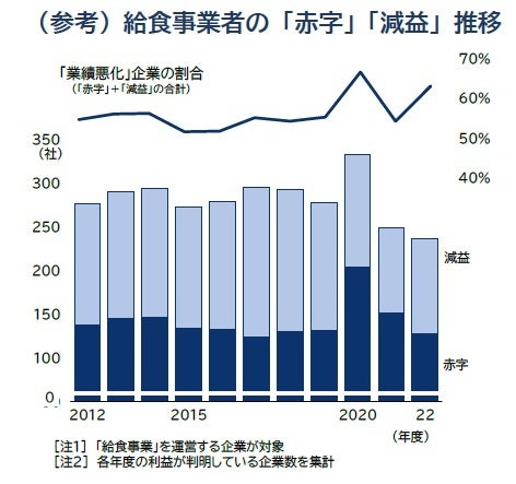 国内で社員食堂や学生食堂の運営、給食サービスを提供する企業を調査した結果、2022年度の利益動向が判明した374社のうち、34%にあたる127社が「赤字」運営だったことが分かった。前年度から「減益」となったケースを含めると、全体の6割超で業績が「悪化」した。また、コロナ禍以降(2020年度~)から3年連続で赤字となった企業は1割を占めた。値上げ交渉が難航する事業者が多くみられ、厳しい採算状況を強いられている。
