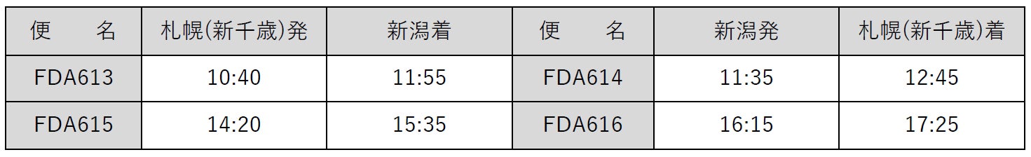 株式会社フジドリームエアラインズ(略称:FDA、本社:静岡県静岡市、代表取締役社長:楠瀬 俊一)は、夏ダイヤの運航開始日である2025年3月30日(日)に『札幌(新千歳)=新潟』線および『福岡=札幌(新千歳)』線を開設することを決定し、運航ダイヤおよび運賃を国土交通省に届出いたしました。