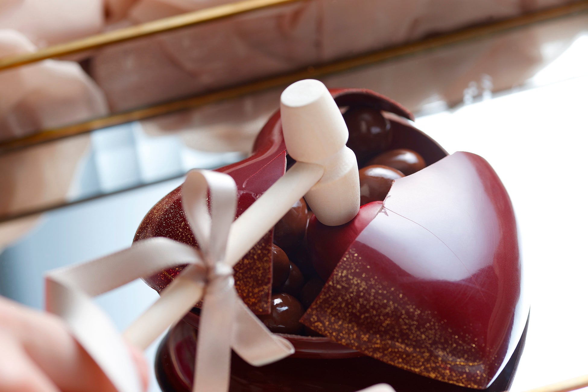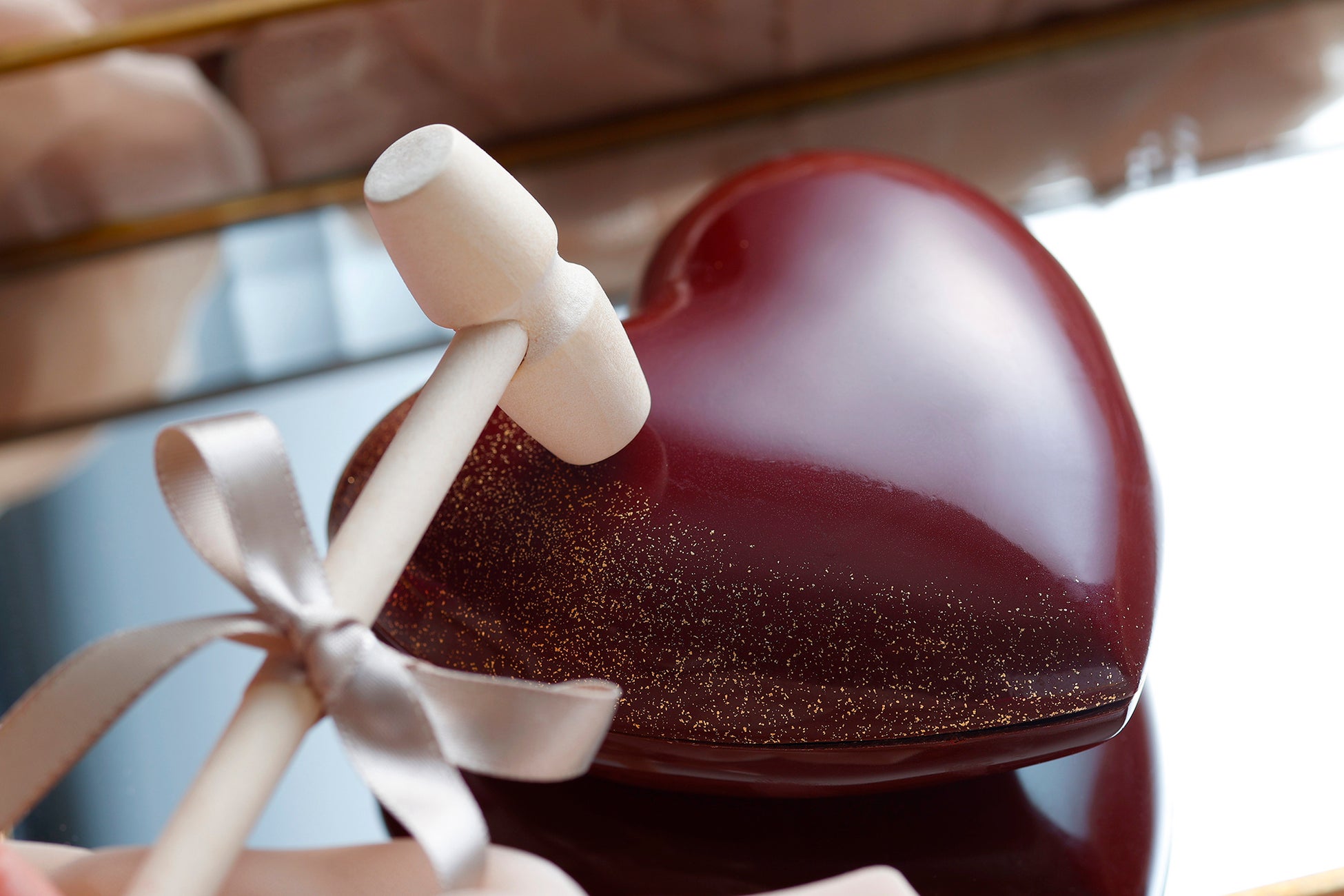 ザ ストリングス 表参道がお届けする2025年のバレンタインギフトは、“ハッピー”と“愛情”の意味を込めた2種のハート型チョコレート。ハンマーでチョコレートを割ると、幸せを届ける1粒の宝石をイメージした真っ赤なチョコレートボンボンとアーモンドチョコレートが佇む、甘くて華やかなサプライズ演出をお楽しみいただけます。