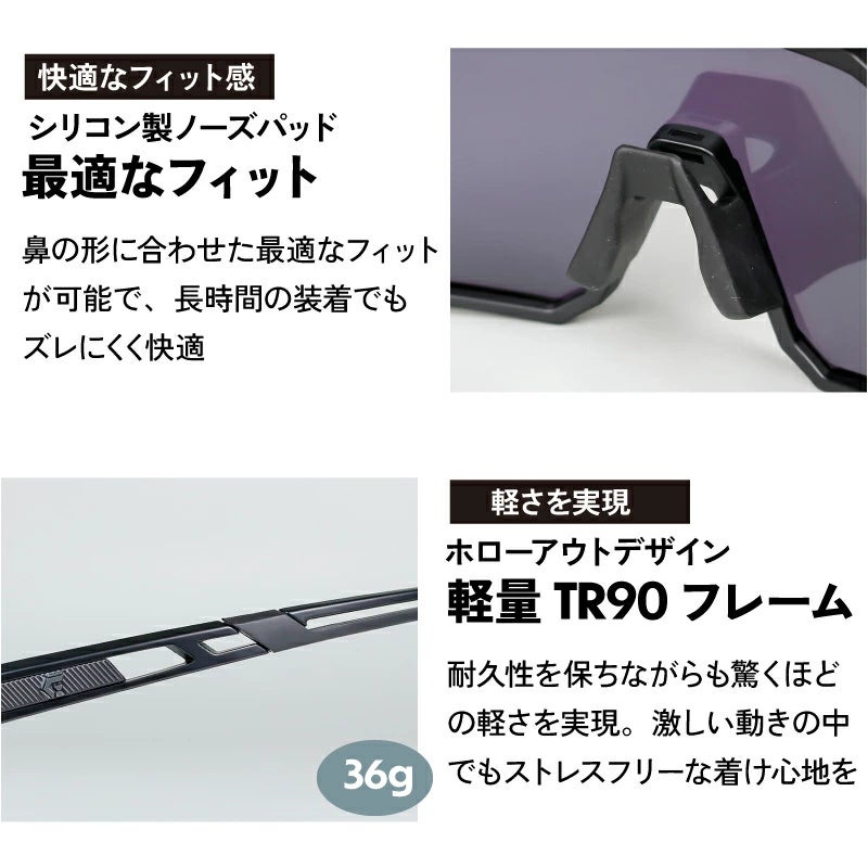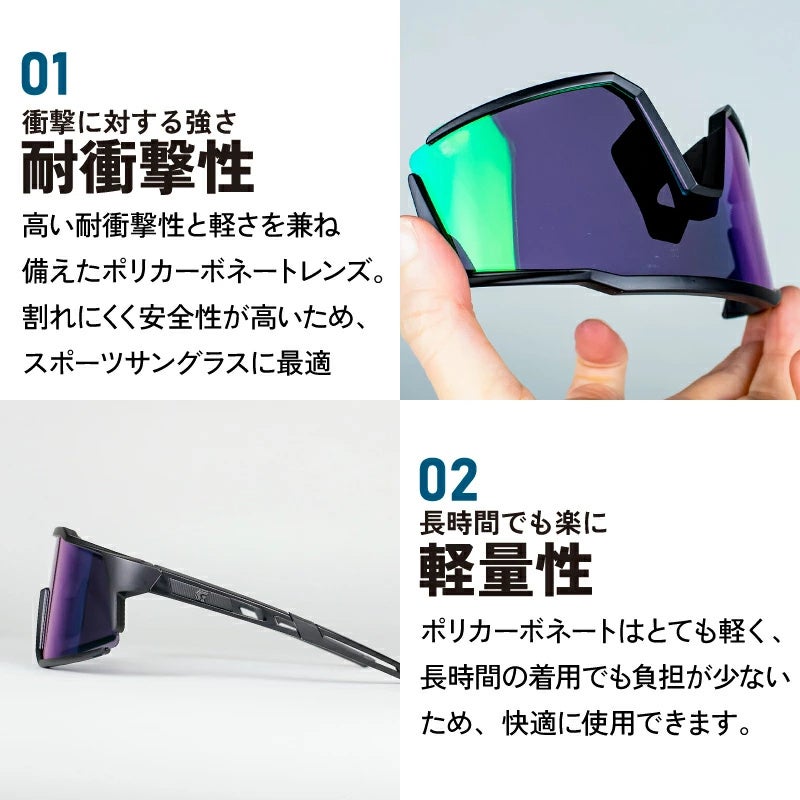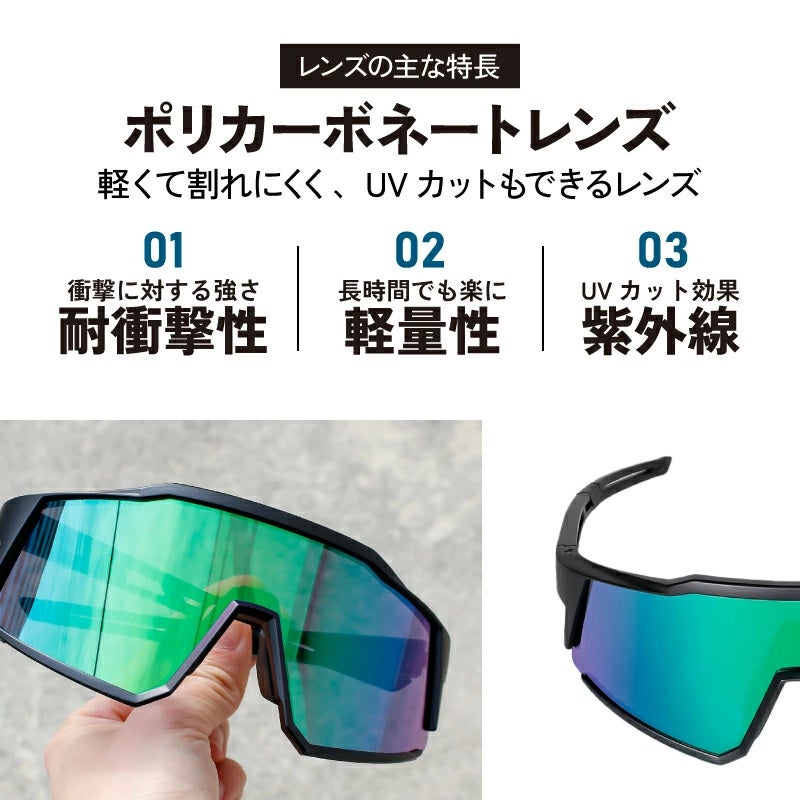 このスポーツサングラスは、耐衝撃性・軽量性に優れたポリカーボネートレンズを採用し、