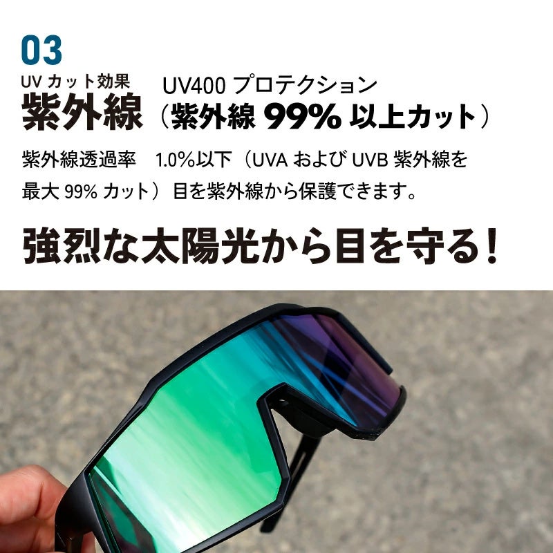 UV400プロテクション機能により紫外線を99%以上カットし、目をしっかり保護します。