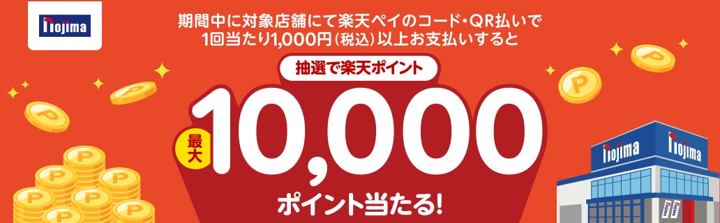 本キャンペーンは、キャンペーン期間中にキャンペーンページよりエントリーのうえ、対象店舗にて「楽天ペイ」で1回あたり1,000円(税込)以上の支払いをした方の中から、抽選で7,800名に「楽天ポイント」最大10,000ポイントを進呈します。そのほか、ポイントの進呈には条件があり、特典のポイント(期間限定ポイント含/上限あり)にも条件があります。詳細は「キャンペーン概要」または、キャンペーンページをご確認ください。