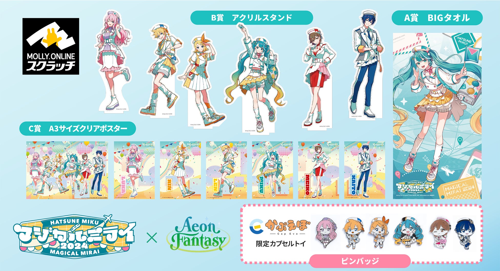 株式会社イオンファンタジー(本社:千葉県千葉市、代表取締役社長:藤原徳也、以下、当社)は、当社が運営する「モーリーオンラインスクラッチ」(https://www.scratch.molly.online/)にて、イベント『初音ミク「マジカルミライ 2024」』の限定グッズ3等賞14アイテムが当たる『モーリーオンラインスクラッチ』と、アミューズメント施設「モーリーファンタジー」「PALO」、カプセルトイ専門店「TOYS SPOT PALO」などに設置する当社オリジナル完全キャッシュレスカプセルトイマシン「かぷえぼ」限定のカプセルトイを、8月9日(金)正午より展開いたします。グッズには、「たま」さん描き下ろしの『初音ミク「マジカルミライ 2024」』メインビジュアルをはじめ、「鹿田ない」さん、「ひなつ」さんがイベント用に描き下ろしたビジュアルをデザインしています。