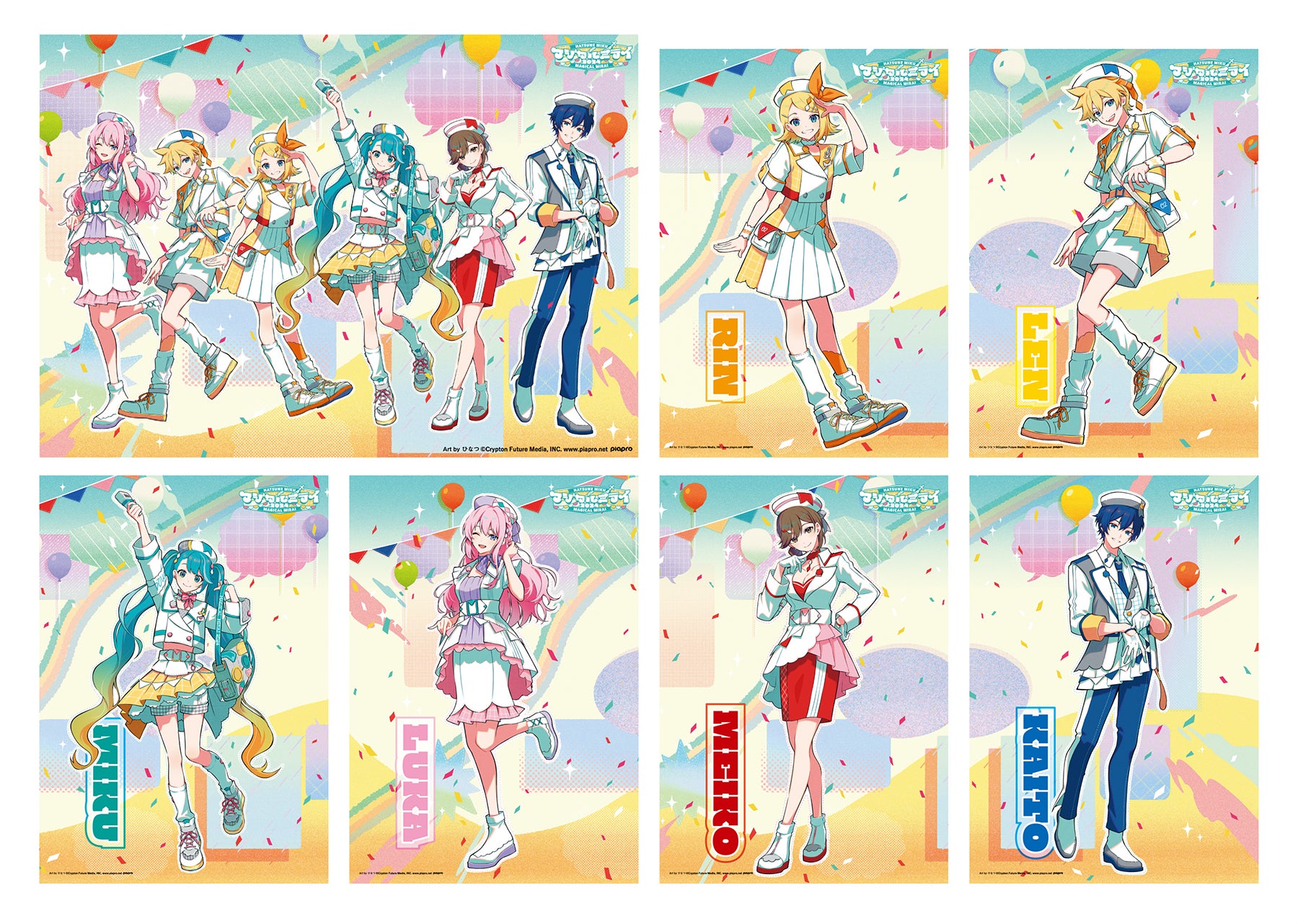 「初音ミク」、「鏡音リン」、「鏡音レン」、「巡音ルカ」、「MEIKO」、「KAITO」の6名と、ピアプロキャラクターズが集合したデザインの全7種類。