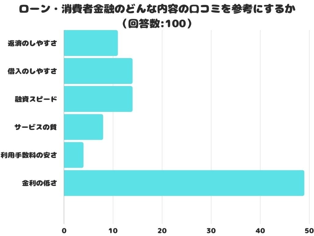 ローン・消費者金融のどんな内容の口コミを参考にするかをアンケートにて調査したところ、1位は「金利の低さ」でした。