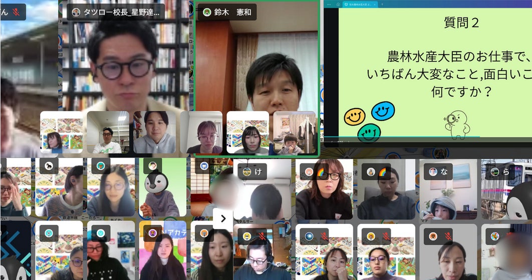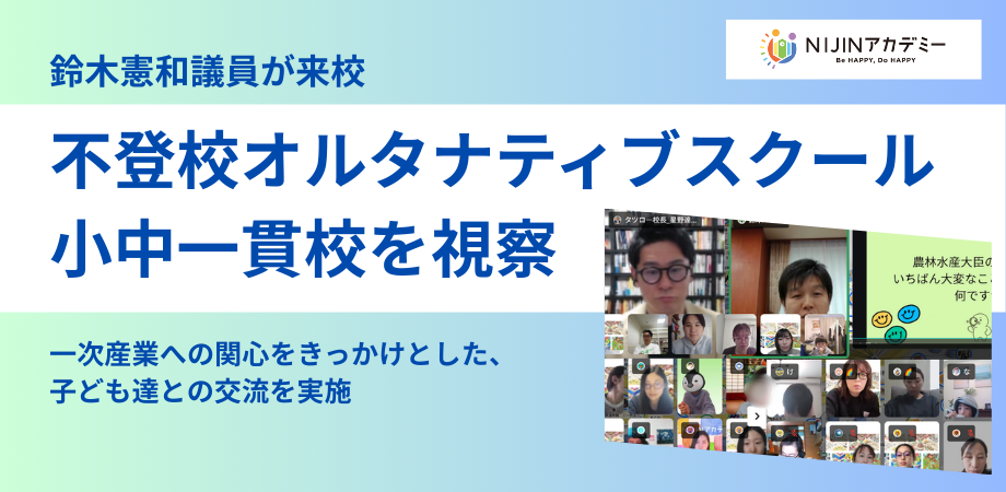 株式会社NIJIN(本社:東京都江東区、代表取締役:星野達郎、以下「NIJIN」)が運営するオルタナティブスクール 「NIJINアカデミー」 は、2026年1月21日(水)に当時の農林水産大臣・鈴木憲和氏を招いたメタバース空間での特別授業が行われました。 今回の来校は、同校の子ども達が日々の学びを通じて一次産業への関心を深め、自ら鈴木氏へ連絡を行ったことで実現したものです。当日は、職務紹介や、子ども達による活動報告が行われ、国政と教育現場を繋ぐ貴重な対話の場となりました。