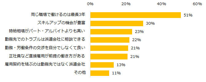 「なんとなく理解している」「あまり理解していない」と回答した方に、派遣ならではの特徴の中で知らなかったものを伺うと、上位は「同じ職場で働けるのは最長3年」(51%)、「スキルアップの機会が豊富」(30%)、「時給相場がパート・アルバイトよりも高い」(23%)でした。