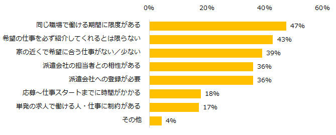 一方でデメリットに感じることを伺うと、トップは「同じ職場で働ける期間に限度がある」(47%)でした。
