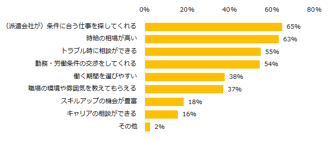 パート・アルバイトと比較し、派遣のメリットだと思うことを伺うと、上位は「(派遣会社が)条件に合う仕事を探してくれる」(65%)、「時給の相場が高い」(63%)、「トラブル時に相談ができる」(55%)でした。メリットを感じた具体的なエピソードも紹介します。