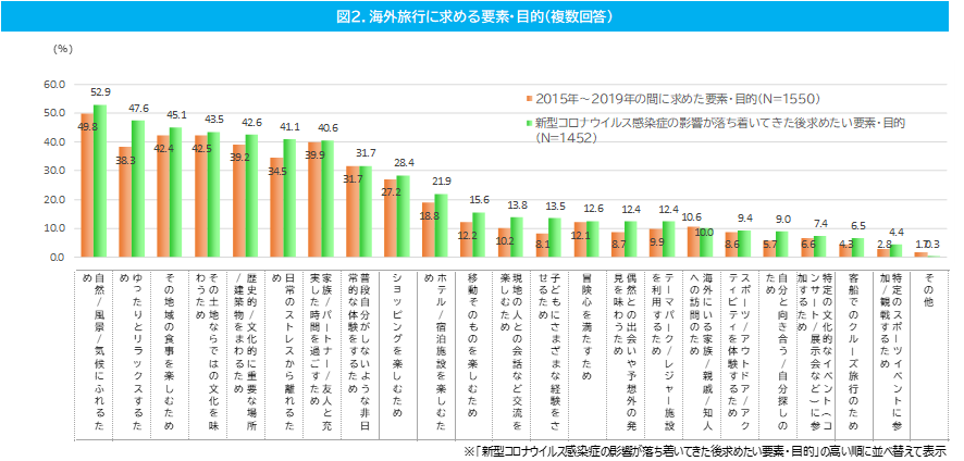 次に、海外旅行に求める要素や目的を見ていきましょう。図2ではコロナ禍以前の5年間の旅行で求めたものと今後求めたい要素・目的を比較しています。30%以上の回答となった項目は双方共通しており、全体傾向の大きな変化は見られませんが、項目ごとに見ていくと「ゆったりとリラックスするため」が9.3ポイント、「日常のストレスから離れるため」が6.6ポイント上昇。また、「子どもにさまざまな経験をさせるため」も5.4ポイント増加しています。