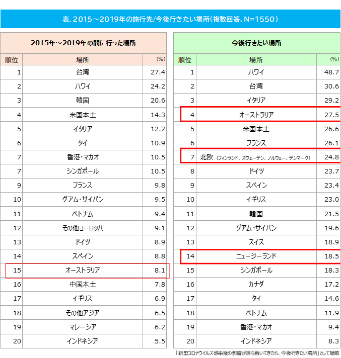 - 行きたい先は「ハワイ」「台湾」「イタリア」。「オーストラリア」「北欧」も上位に