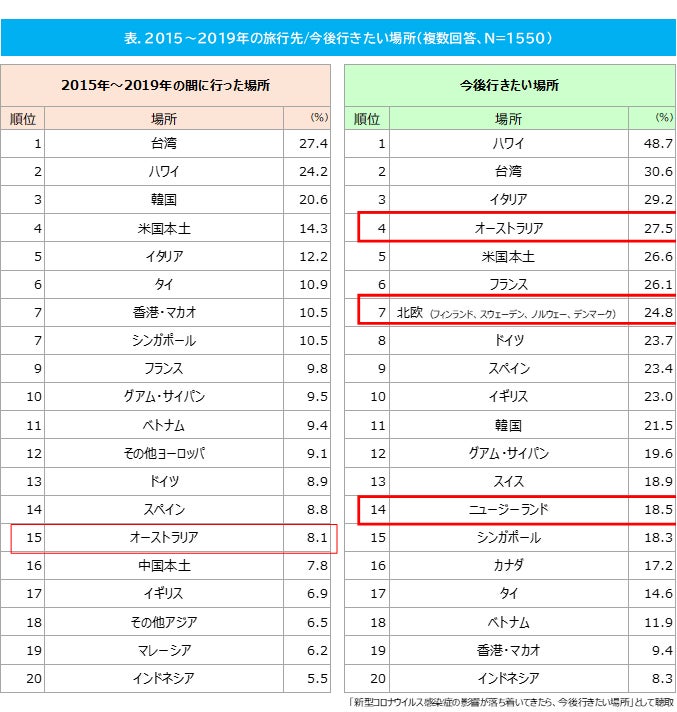 行きたい先は「ハワイ」「台湾」「イタリア」。「オーストラリア」「北欧」も上位に